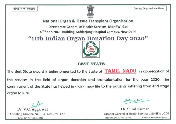 "உடல்உறுப்பு தானம் & உறுப்புமாற்று அறுவை சிகிச்சையில் தொடர்ந்து 6வது முறையாக தமிழகம் முதலிடம்" பெற்று மத்திய அரசின் விருது பெறுவது மகிழ்ச்சி அளிக்கிறது.