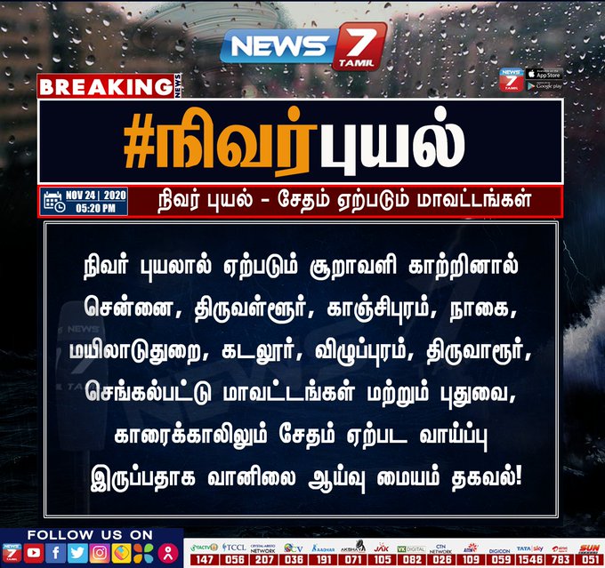 நிவர் புயலால் ஏற்படும் சூறாவளி காற்றினால் சென்னை, திருவள்ளூர், காஞ்சிபுரம், நாகை, மயிலாடுதுறை, கடலூர், விழுப்புரம், திருவாரூர், செங்கல்பட்டு மாவட்டங்களில் ஏற்பட வாய்ப்பு இருப்பதாக மண்டல வானிலை ஆய்வு மையம் தகவல்!
