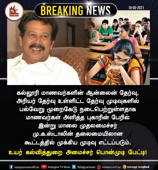இந்நிலையில், புதியதாக உயர்கல்வித்துறை அமைச்சராக பொறுப்பேற்ற பொன்முடி இன்று சென்னை தலைமைச் செயலகத்தில் தமிழகத்தில் உள்ள அனைத்து பல்கலைக்கழக துணைவேந்தர்கள், அண்ணா பல்கலைக்கழக பதிவாளர் மற்றும் தேர்வு கட்டுப்பாட்டு அதிகாரிகளுடன் கல்லூரி தேர்வுகள் பிரச்சினை தொடர்பாக இன்று ஆலோசனை மேற்கொண்டார்.