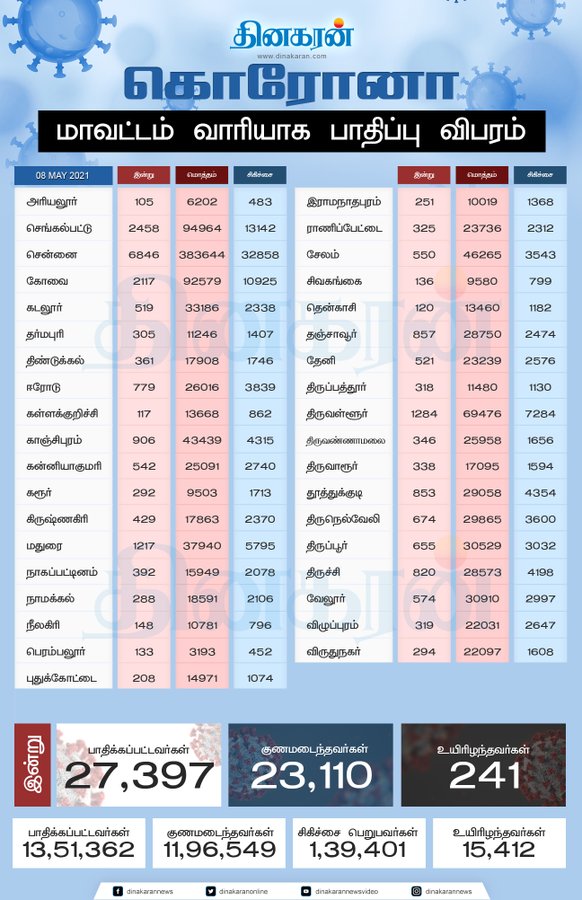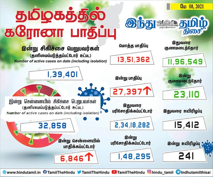 பரிசோதனைகள், பாதிப்பு, குணமடைந்து வீடு திரும்பியவர்கள் என அனைத்துத் தகவல்களையும் தெரிந்து கொள்ள இங்கே க்ளிக் செய்யவும்