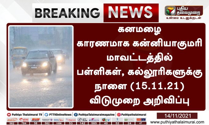 திருவள்ளூர் மாவட்டத்தில் காட்டூர், நடுகுத்தகை, நந்தியம்பாக்கம், பூனிமாங்காடு பகுதிகளில் நிவாரண முகாம்களாக செயல்படும் 12 அரசுப் பள்ளிகளுக்கு விடுமுறை அறிவிக்கப்பட்டுள்ளது. பிற இடங்களில் வழக்கம் போல் இன்று பள்ளிகள் இயங்கும் என தெரிவிக்கப்பட்டுள்ளது.