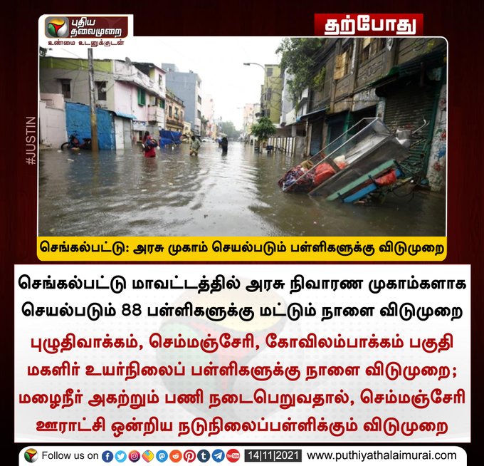 செங்கல்பட்டு மாவட்டத்தில் தற்காலிக அரசு நிவாரண முகாமாக செயல்படும் பள்ளிகளுக்கு மட்டும் நாளை விடுமுறை - மாவட்ட ஆட்சியர் ராகுல்நாத் மழைநீரை அகற்றும் பணிகள் நடைபெறுவதால் புழுதிவாக்கம், செம்மஞ்சேரி, கோவிலம்பாக்கம் பகுதிகளைச் சேர்ந்த மகளிர் உயர்நிலைப் பள்ளிகளுக்கு நாளை விடுமுறை