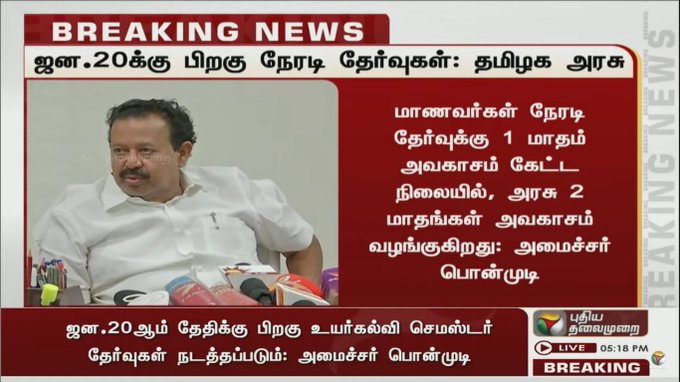 ஜனவரி 20-க்குப் பிறகு கல்லூரி செமஸ்டர் தேர்வுகள் நேரடியாக நடைபெறும். ஆன்லைன் தேர்வு கோரி போராடிய மாணவர்கள் மீதான வழக்குகள் திரும்பப் பெறப்படும். - உயர்கல்வித்துறை அமைச்சர் பொன்முடி அறிவிப்பு!