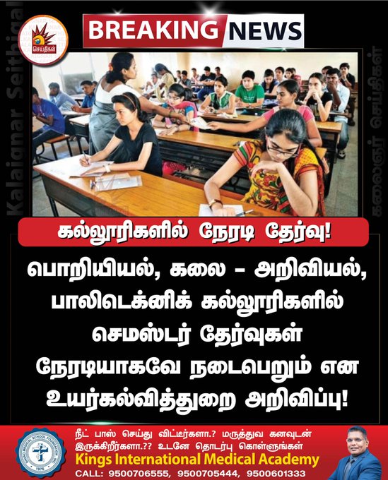 இந்நிலையில், இனி செமஸ்டர் தேர்வுகள் ஆஃப்லைன் வழியே மட்டுமே நடைபெறும் என அறிவிக்கப்பட்டுள்ளது. பொறியியல், கலை மற்றும் அறிவியல், பாலிடெக்னிக் என அனைத்துவகை கல்லூரிகளிலும் செமஸ்டர் தேர்வுகள் நேரடியாக மட்டுமே நடைபெறும் என உயர்கல்வித்துறை திட்டவட்டமாக தெரிவித்திருக்கிறது.